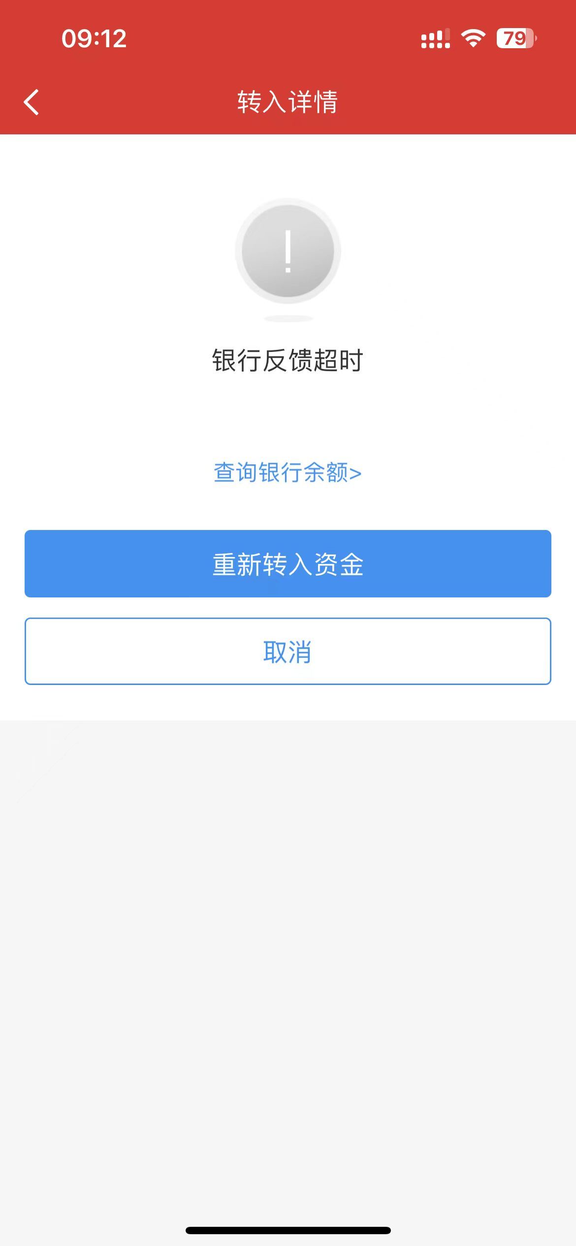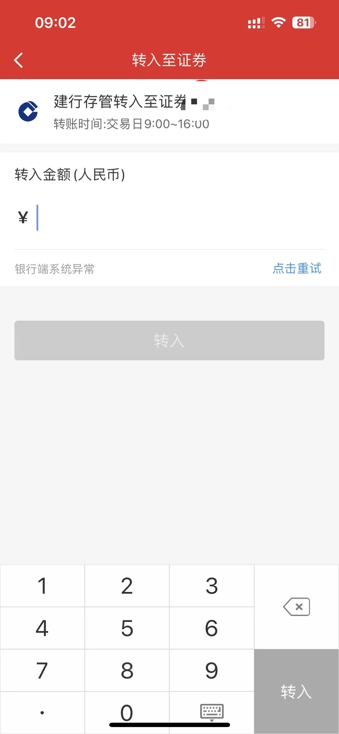 通过建行银证转账,提示“银行反馈超时”,点击查询“银行端系统异常”,直至9时12分银行才提醒转账成功。